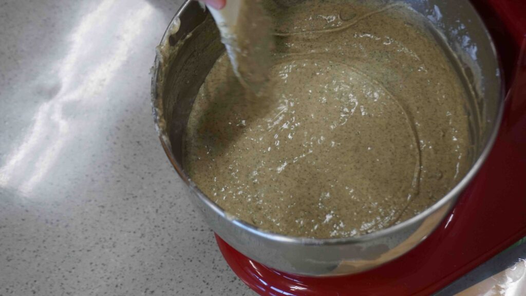▼事前に作っておいたヨモギのジェノベーゼを生地に練り込みます。